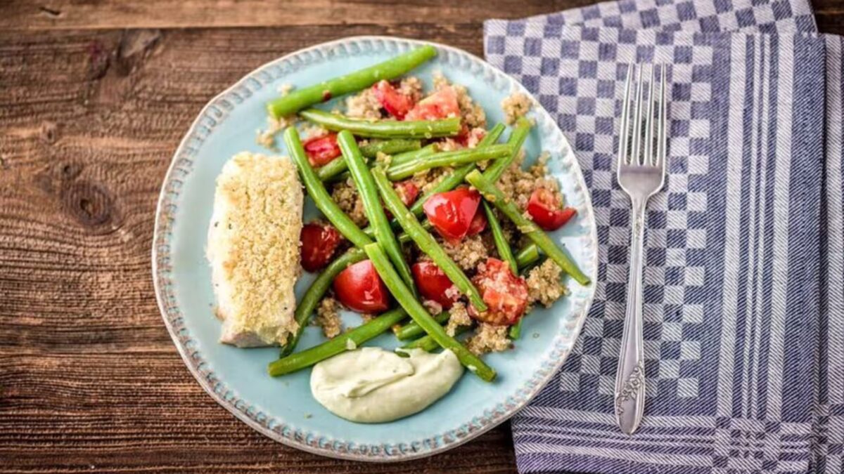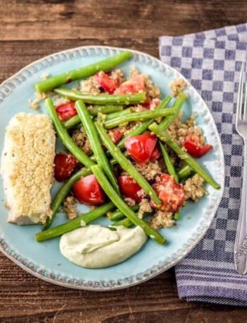 Panko-Crusted Mahi Mahi with Wasabi Aioli, Quinoa, and Green Bean-Tomato Saute Pungent wasabi gives a nice little kick to the …