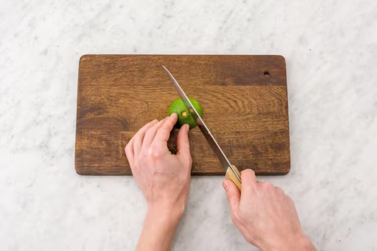 Prep the ingredients: Preheat the oven to 350 degrees. In a small pot, bring 1 cup water with a large pinch of salt to a boil. Zest and halve the lime. Cut one half into wedges. Halve, peel, and finely chop the shallot. Halve the tomatoes.