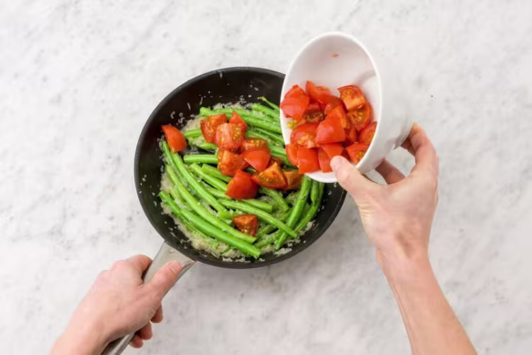 Saute the green beans and tomatoes: Meanwhile, heat 1 Tablespoon butter in the same pan over medium heat. Add the shallot and green beans and cook, tossing, for 4-5 minutes, until the shallots are softened. Add a splash of water to the pan and let the green beans steam until tender. Add the tomatoes and cook, tossing, for another 1-2 minutes, until heated through. Season with salt and pepper.