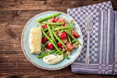 Panko-Crusted Mahi Mahi with Wasabi Aioli, Quinoa, and Green Bean-Tomato Saute