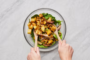 • Add spinach to bowl with cooled chickpeas, onion, and croutons. Toss with remaining dressing until evenly coated.