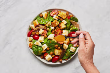 We love a good Caprese salad, so here’s a bigger, better version that’s chock-a-block with ingredients and totally dinner-worthy. Fresh spinach provides the leafy base with caramelized onion throughout for pops of sweetness. Crisp roasted chickpeas add a protein boost while garlicky ciabatta croutons up the crunch factor even more. Of course, it wouldn’t be Caprese without the tomatoes and fresh mozzarella, but we made them bite-size so they’re more fork friendly. A creamy balsamic dressing ties it all together with Caprese's characteristic flair.