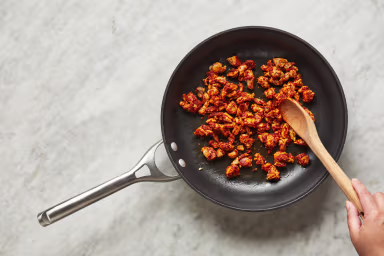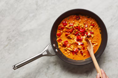 • Add tomato paste, curry powder, and paprika to pan with chicken. Add a pinch of chili flakes if you like things spicy.