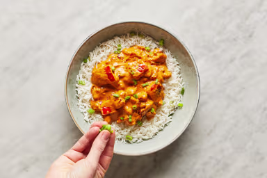 A flavorful homemade curry for dinner can be just as easy as a grilled cheese or quick stir-fry, and this recipe is perfect proof. Juicy diced chicken thighs are seared until browned, then coated in tomato paste, chili flakes, and aromatic spices and simmered in creamy, nutty, mildly sweet coconut milk. It’s all finished with tender bell pepper, then spooned over steamy basmati rice for soaking up every last drop of curry.