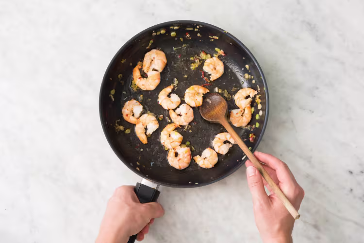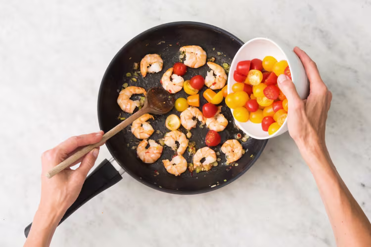Meanwhile, add tomatoes to pan with shrimp. Cook, tossing, until wilted and juicy, 2-3 minutes. Season with salt and pepper. Remove from heat and set aside until pasta is ready. TIP: If you like it extra hot, add any remaining chili (to taste) at this point.