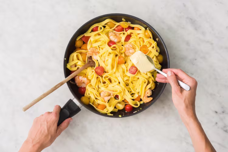 Once tagliatelle is done cooking, return pan with shrimp and tomatoes to medium heat and add tagliatelle and 2 TBSP butter. Toss to combine and melt butter. Season with salt and pepper.