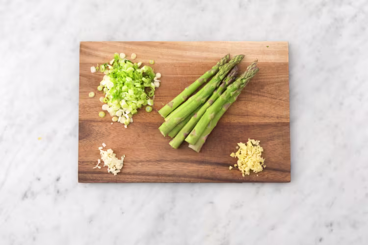 Wash and dry all produce. Bring 1½ cups water and a pinch of salt to a boil in a small pot. Trim and discard bottom inch from asparagus, then cut stalks into 2-inch pieces. Mince or grate garlic. Trim and thinly slice scallions. Peel and mince ginger.
