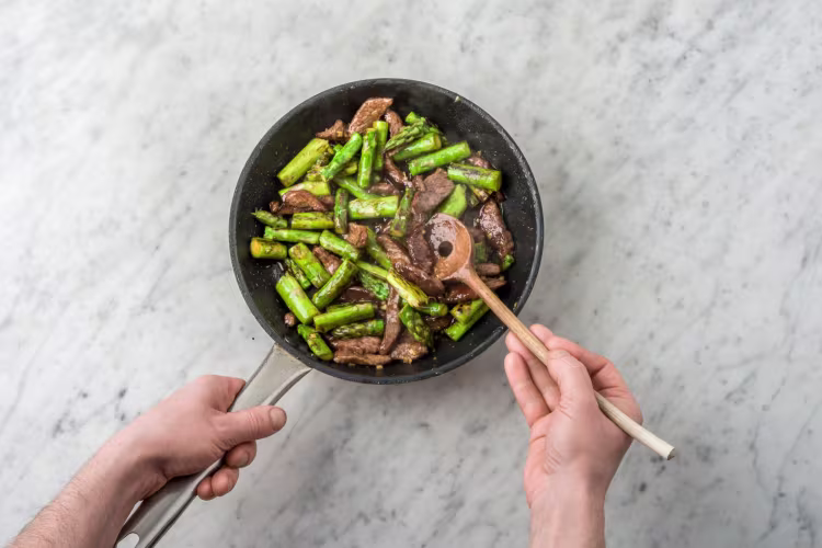Add asparagus and scallions to same pan over medium heat. (TIP: If veggies seem dry, add a drizzle of oil.) Cook until tender but still crunchy, 3-4 minutes, tossing occasionally. Add steak tips and sauce to pan and cook until sauce is thickened and meat reaches desired doneness, 2-3 minutes. Season with salt and pepper.