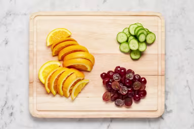 • Thinly slice cucumber into rounds. Halve orange; slice crosswise into ½-inch-thick half-moons. Halve grapes if desired.