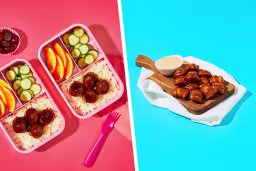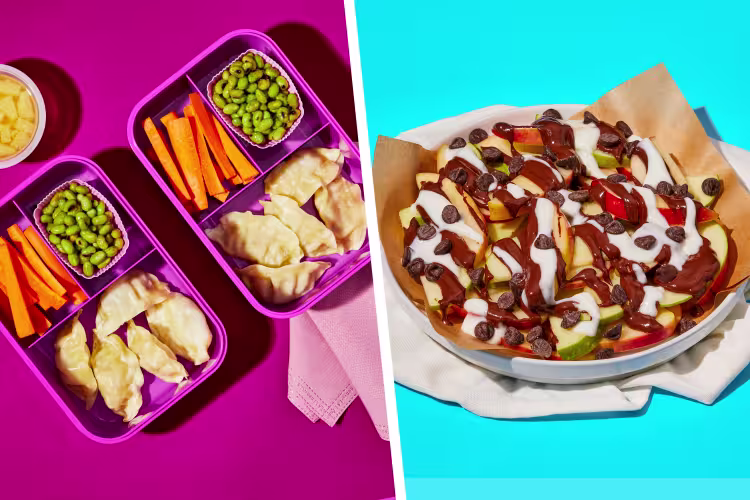 Does planning, cooking, and packing kids’ lunches + snacks feel like a part-time (or full-time) job? We feel you, and we’re here to help. This 15-minute lunch (+ 15 minute snack) is the perfect make-ahead lunchbox time-saver: a kid-approved saucy meatball and rice bowl complete with cucumber, orange slices, and grapes—to stay or to go! But that’s not all—it’ll be snack time before you know it! Serve up buttery cinnamon-sugar pretzel bites with a peachy yogurt dipping sauce. That’s right: We’re thinking outside the lunchbox (so you don’t have to!).