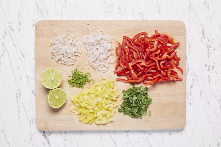 Wash and dry all produce. Halve, peel, and thinly slice shallot. Mince a few slices until you have 1 TBSP. (For 4 servings, thinly slice both shallots and mince until you have 2 TBSP.) Halve, core, and deseed bell pepper, then thinly slice. Chop cilantro. Zest and halve lime. Drain pineapple over a small bowl, reserving juice. Roughly chop fruit.