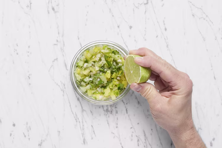 In a medium bowl, combine pineapple, 1 TBSP pineapple juice, minced shallot, cilantro, and lime zest. Squeeze in the juice from lime halves. Season with a small pinch of salt. Toss to combine and set aside.