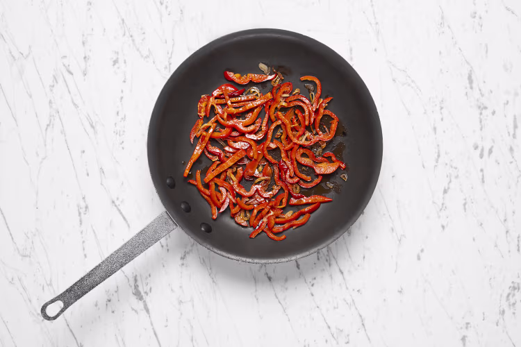 Heat a drizzle of oil in a large pan over medium-high heat. Add sliced shallot, bell pepper, and a large pinch of salt. Cook, stirring occasionally, until tender and starting to char, 5-7 minutes. Season with salt and pepper, then transfer to a plate and set aside.
