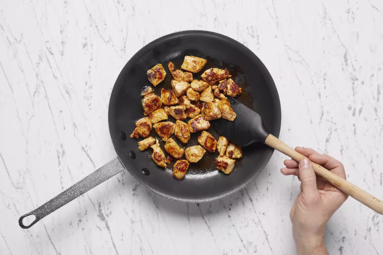 Pat chicken dry with paper towels. Heat another large drizzle of oil in same pan over medium-high heat. Add chicken, half the Southwest Spice and Blackening Spice (use all of both spices for 4 servings), and a few large pinches of salt. Cook, tossing occasionally, until meat is cooked through, 4-6 minutes.