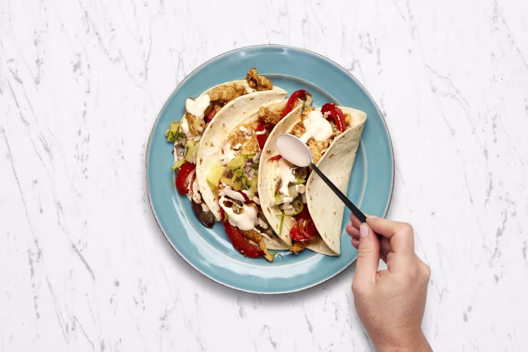 Wrap tortillas in damp paper towels. Microwave on high until warm, about 30 seconds. Divide tortillas between plates, then fill each with chicken and veggies. Spoon salsa over, drizzle with crema, and serve.