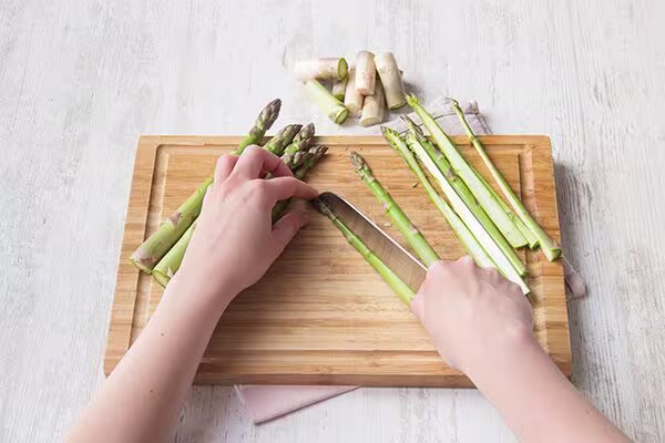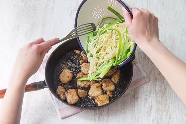 Add the asparagus to the boiling water for 2-3 minutes, until tender, then remove with a slotted spoon and place in the ice water. Add the noodles to the boiling water and cook for 2-3 minutes, or until al dente. Drain.
