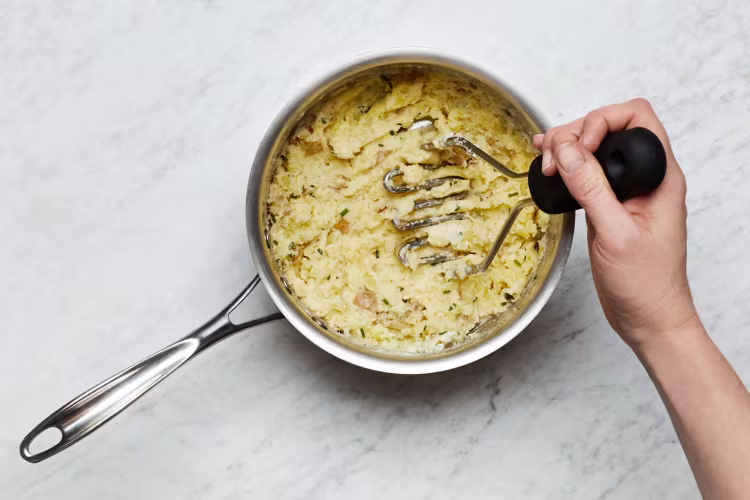 • Mash until smooth, adding splashes of reserved potato cooking liquid as needed. Season with salt and pepper.