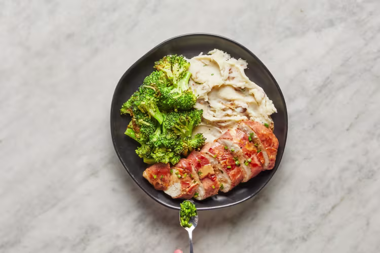 Break out the cloth napkins and the nice plates, because prosciutto-wrapped-anything on a menu calls for setting the table. Tonight, our chef’s gourmet-ified chicken by wrapping it with crispy, flavorful slices of dry-cured ham. And no restaurant-worthy dish would be complete without the sides: This one has truffle chive mashed potatoes and lemony broccoli. No pressure, but it might be about time to learn the art of napkin folding…