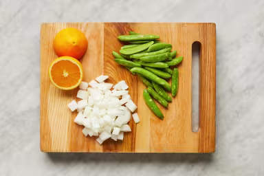 • Halve orange. Halve, peel, and dice onion into large chunks. Trim and remove strings from snow peas if necessary (refrigerate until ready to use in Step 4).
