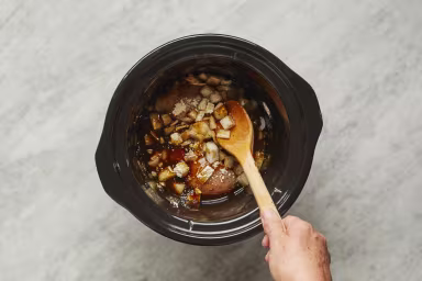 • In a 5- to 6-quart slow cooker, combine chicken and onion; season with garlic powder, salt, and pepper. Add soy mixture and stir to combine. TIP: If you like, rinse out bowl used for sauce to reuse in the next step.