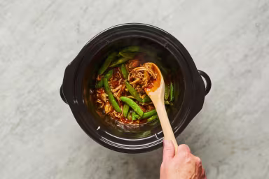 • Return shredded chicken to slow cooker along with snow peas; season snow peas with salt and stir to combine.