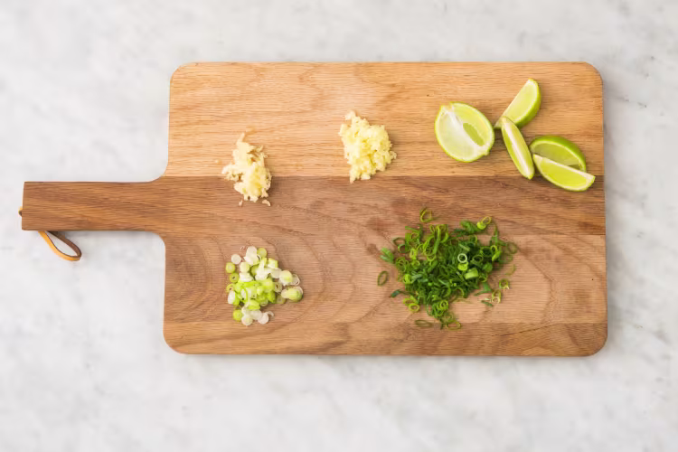 Wash and dry all produce. Adjust rack to middle position and preheat oven to 425 degrees. Bring 2½ cups water and a large pinch of salt to a boil in a medium pot. Peel ginger and mince until you have 2 TBSP. Mince garlic. Trim, then thinly slice scallions, keeping greens and whites separate. Halve lime; cut one half into wedges.