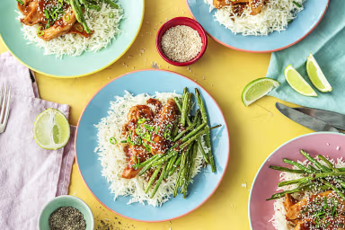 Add chicken to pan and toss to coat. Cook until no longer pink in center, 2-3 minutes. Add a squeeze of lime to rice, then fluff with a fork. Divide rice, green beans, and chicken between plates. Drizzle with any sauce in pan. Sprinkle with scallion greens and remaining sesame seeds. Serve with lime wedges.