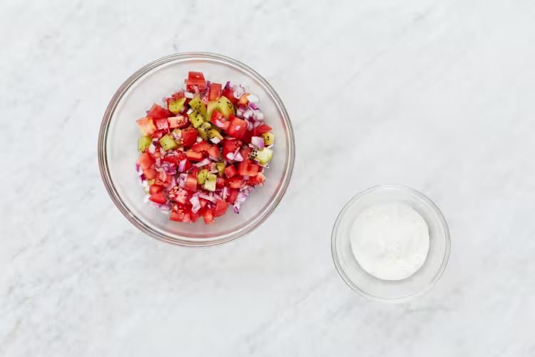 Peel and dice kiwi. Dice tomato.