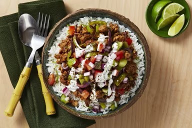 Forget the 14-hour flight and flower lei—we’re packing all the deliciousness of a luau feast into one quick and delicious dish! You’re about to experience a melange of sweet and savory flavors inspired by the Aloha state. We’re talking bright kiwi and tomato salsa, creamy garlic-lime crema, a tangle of lightly charred veggies, and crispy, teriyaki pork, all arranged over fluffy jasmine rice. Prepare your taste buds for a trip to the tropics.