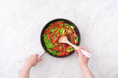 Heat a large drizzle of oil in a large pan over high heat. Add green beans, bell pepper, and scallions and toss until softened and starting to brown, 4-5 minutes. Season with salt and pepper. Remove from pan and set aside.