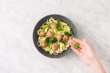 Remove meatballs from pan and set aside on a plate. Heat another drizzle of oil in same pan over medium-high heat. Add broccoli and cook, tossing, until tender and lightly crisped, 3-4 minutes. (TIP: If you’re having trouble getting the broccoli to cook, add 1 TBSP water to pan to steam it.) Season with salt and pepper. Remove from pan and set aside.